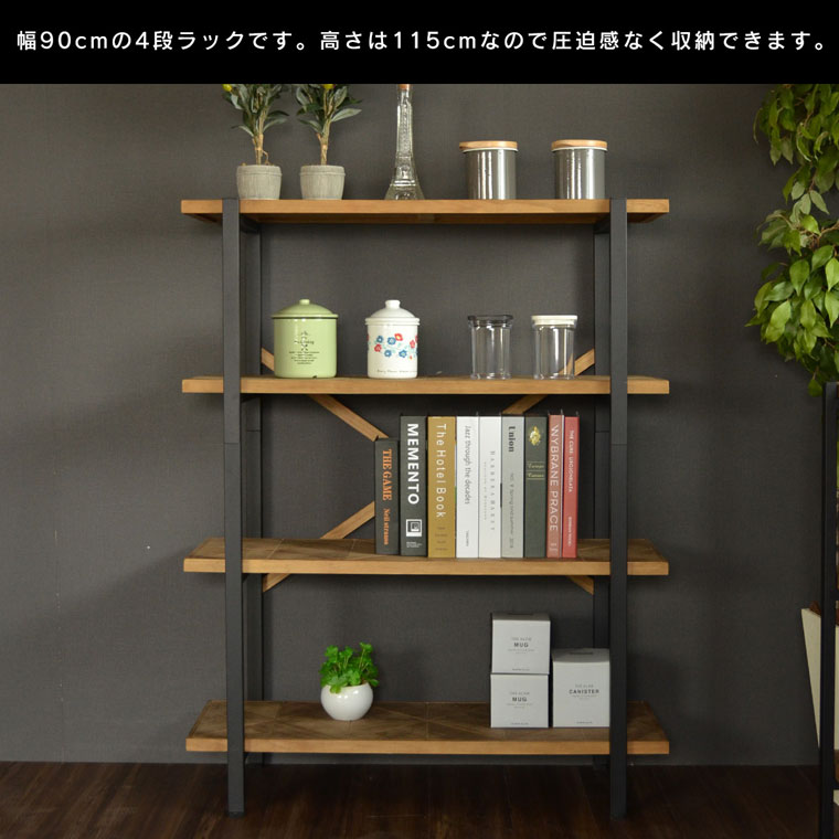商品サイズ 全体:幅90.2×奥行37×高さ115cm 内寸:幅68.2×奥行31.8×高さ31cm (格段共通) 材質 棚板:パイン材 (天然木) 本体:スチールパイプ 塗装:棚板:ラッカー塗装 / パイプ:粉体塗装 商品詳細 組立品 重量:約16kg 耐荷重:約15kg×4枚 商品説明 ・カレイドシリーズ 三角形にカットした古材風のパイン材をジオメトリックに並べた、質感の高い天板・棚板に、無骨でシンプルなアイアンパイプを組み合わせたシリーズです。